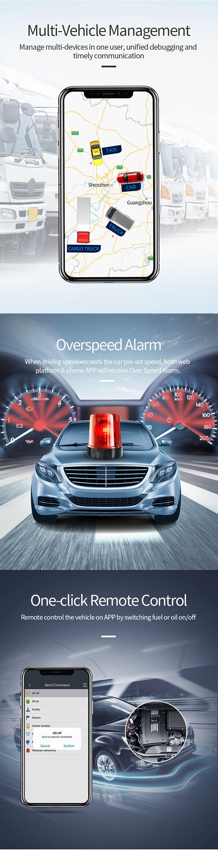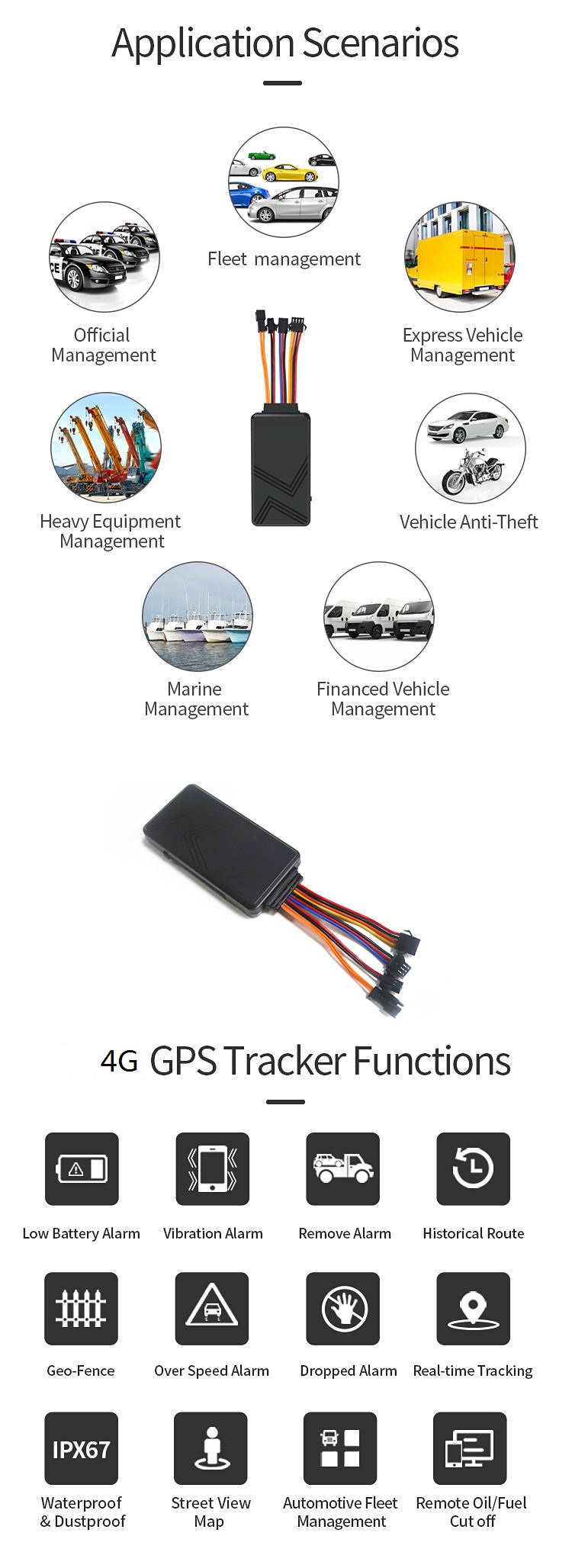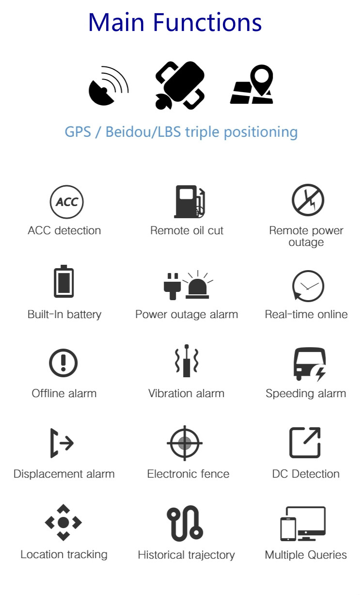 3. Functions: Remote audio monitoring, remote power/fuel off, SOS alarm, ACC detection, power off alarm, overspeed alarm, move alarm, ACC illegal engine on alarm, etc...